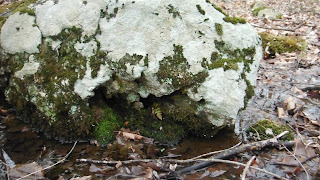 This boulder should have been a clue, down at the northwestern end of this enclosed space, the zigzag remains of that same stone row that bounds that floodplain field by the Nonnewaug Stone Fish Weir on the eastern edge, the old Indian Trail on the western side, another boulder, perhaps humanly enhanced to resemble the head of a timber rattlesnake and the Great Serpent as well - a little fanciful with a rhomboidal shape for the the Snakes left eye: